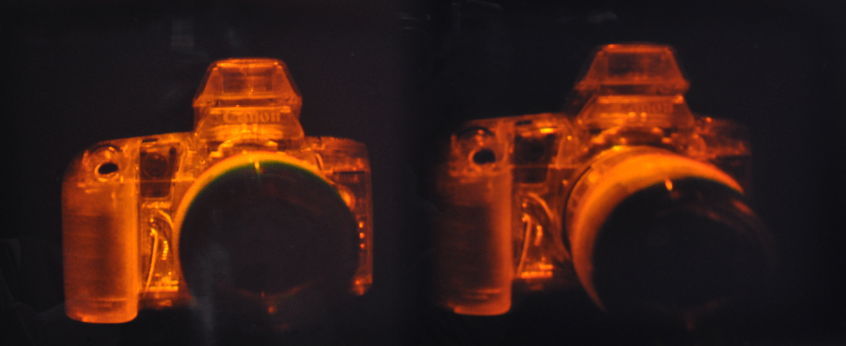人は情報の90%を視覚から得ています。そのため、視認性に優れた画像を得ることや、視認性を数値化して理解することが重要です。より美しく見やすい画像を得ることに加え、見ることをより深く理解するために、“視覚”特性の研究も行っています。現在のほとんどの画像は2次元的情報しかもちませんが、光を使えば3次元的情報のすべてを記録・再生できます。その技術は“ホログラフィー” と呼ばれ、情報の担い手である“光” のすべての情報を記録します。そのホログラフィーをより鮮明に安定して得られるような技術研究をしています。上の写真はホログラフィーの一例です。視点を変えると像も回転し、そこに物があるように見えます。左の写真は体積型立体表示の例です。このように、浮き上がって見えて手で触れられる像を形成する、新しい表示方法の研究も行っています。