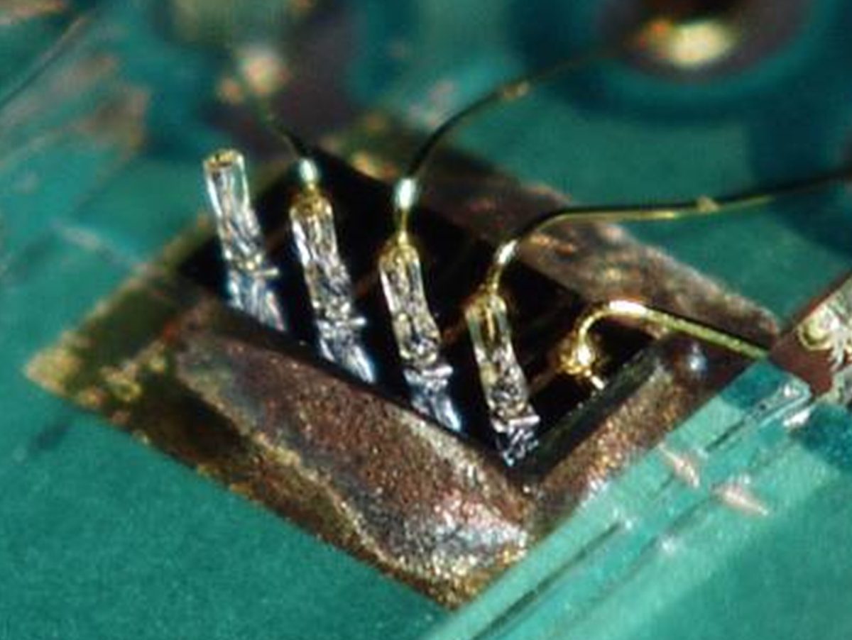 次世代配線技術である、光配線の実用化に向けて必須となる“光-光接続” の実現に向けた研究を行っています。写真は光-光接続を実現するための“光ピン” の例で、レーザー光を直接光ファイバーに導く素子です。髪の毛よりも細い光ピンは、簡便な方法であるにもかかわらず高い性能を実現するデバイスとして、世界的に非常に注目を集めています。学生発のアイディアである光ピンの実用化を目指して、基礎から応用まで広く研究開発をしています。