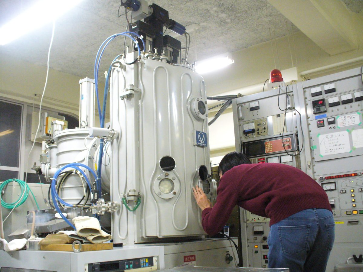 化学的手法も駆使して新材料を創出しています。たとえば、光る繊維は非常に特徴的で実用性も高く、世界的に注目を集めています。右の写真のように、複雑な形状をした装飾品に光沢薄膜を形成することも簡単です。見た目は重要ですね。ただし、実用性を考えると、便利な機能や付加価値があった方が良いでしょう。私たちは“光学薄膜” と呼ばれる、非常に薄い膜を精度よく作り、奇麗であり高機能でもある材料の開発を行っています。左の写真は、私たちの開発した世界唯一の薄膜形成装置で、このような装置を用いた研究を行っています。