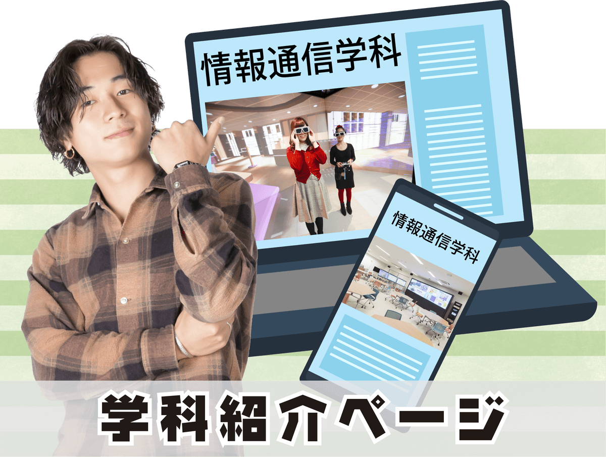 2022年度に情報通信学部の4学科「情報メディア学科・組込みソフトウェア工学科・経営システム工学科・通信ネットワーク工学科」を統合し、情報通信技術を横断的・総合的に学ぶことができる「情報通信学科」を新設しました。これにともない4学科の募集は停止となりましたが、学びの内容は情報通信学科に引き継がれています。