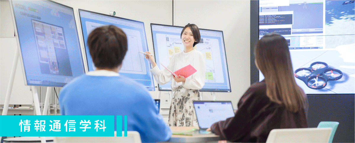 多様化する現代社会においては、課題解決のために総合的な情報通信技術を身に付けた人材が求められます。2022年度より新たな編成となった情報通信学部では、国際標準のカリキュラムを導入し、多岐にわたる情報通信技術を横断的に学び、幅広い知識を身に付けることを目指します。