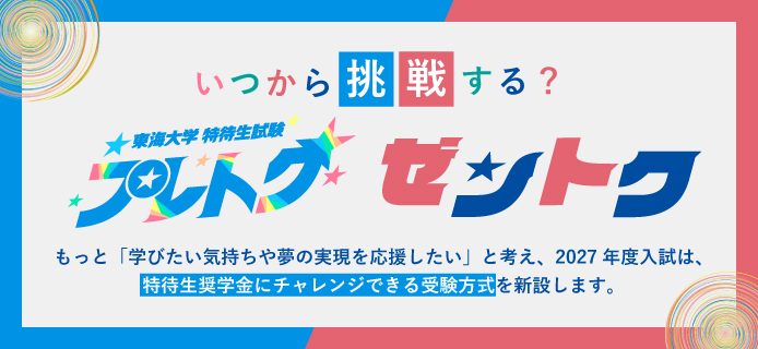 重要なお知らせ 一覧 2026.04.01 2026年度東海大学役職者のお知らせ 2026.03.03 【学生・教職員各位】イラン情勢に伴う注意喚起について 2026.02.20 【在学生・卒業生・修了生・離籍者対象】ファミリーマート・ローソンでの現⋯ 一覧 入試関連リンク 入試情報特設ページ Web出願 郵送出願 Web合否発表・入学手続 News & Events 2026.02.28 2027年度入試より年内の特待生試験を新設予定! 2026.04.15国際学部国際学科 学生有志が「あやせ国際フェスティバル」「ベトナムフェスタ」に参加しました 2026.04.15医学部看護学科医学科 「2026年度医学部入学式」を挙行しました 2026.04.15医学部 伊勢原キャンパスで「新入生歓迎会オリエンテーション」を開催しました 2026.04.14工学部電気電子工学科総合理工学研究科 留学生がペロブスカイト太陽電池の研究で優秀口頭発表賞を受賞しました 2026.04.14情報通信学部 情報通信学部の学生らが東京都港区の科学イベントをアシストしました 2026.04.13文化社会学部心理・社会学科 心理・社会学科の田中講師が「2025年度ティーチング・アワード」優秀賞に選出されました 2026.04.14 <開催案内>東海大学大学院研究成果のポスター発表 2026.04.13医学部看護学科 医学部看護学科が「2026年度新入生研修会」を実施しました 2026.04.13工学研究科建築土木工学専攻建築都市学部建築学科 湘南キャンパス14号館地下1階を学生の憩いの場としてリニューアルしました 2026.04.13 「第55回海外研修航海」の研修団が木村学長に成果を報告しました 2026.04.13 湘南キャンパスの吹奏楽研究会が全日本アンサンブルコンテスト大学の部で金賞を獲得しました 過去のお知らせ一覧 学部を探す ・国際学部 ・経営学部 ・観光学部 ・情報通信学部 ・政治経済学部 ・文学部 ・文化社会学部 ・法学部 ・教養学部 ・児童教育学部 ・体育学部 ・健康学部 ・理学部 ・情報理工学部 ・建築都市学部 ・工学部 ・医学部 ・人文学部 ・海洋学部 ・文理融合学部 ・農学部 ・国際文化学部 ・生物学部 Campus 品川キャンパス 湘南キャンパス 伊勢原キャンパス 静岡キャンパス 熊本キャンパス 阿蘇くまもと臨空キャンパス 札幌キャンパス Pick up 研究ニュース スポーツインフォ 入学案内 海外研修航海 ToCoチャレ 奨学金 TOKAIスポーツ ニュースリリース 卒業にあたってのアンケート 認証評価 教育研究上の目的及び養成する人材像と3つのポリシー