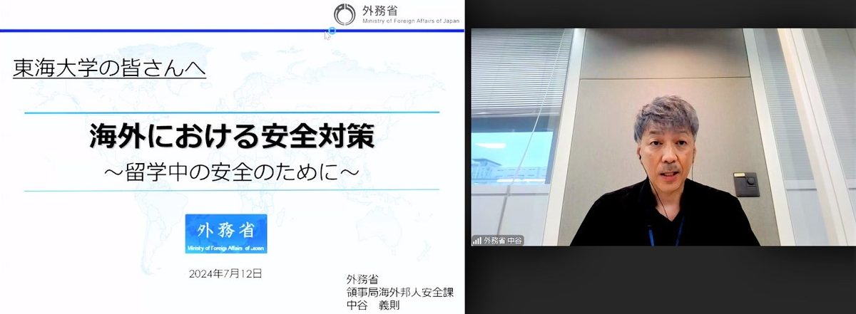 東海大学では7月12日にオンラインで、「海外危機管理セミナー」を開催しました。本学学生・教職員を対象に、海外での重大事件や凶悪犯罪に巻き込まれないための予防策や、万一巻き込まれた場合の対処策について理解してもらうことを目的に2018年度から実施しています。今回は、「海外における安全対策~留学中の安全のために~」と題して外務省領事局海外邦人安全課で課長補佐を務める中谷義則氏が、海外に渡航する際の基本的な心構えや海外での情報収集の方法について講演。学生や教職員ら約170名が聴講しました。