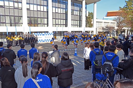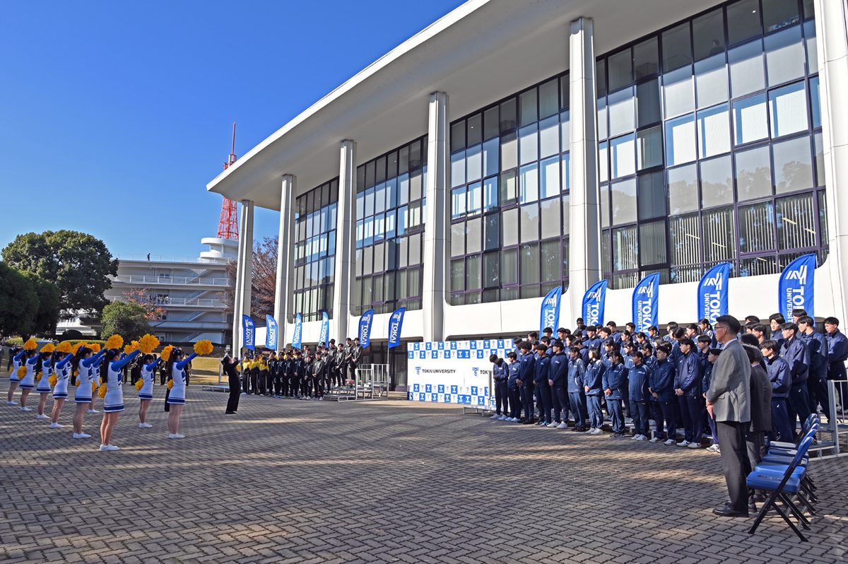 湘南キャンパスで11月26日に、スポーツプロモーションセンター(SPC)が主催する「2025年度12月期インカレ出場クラブ壮行会」を開催しました。本キャンパスで活動する運動部の中で、12月に行われる大学スポーツの全国大会である「インカレ」に出場する5団体が一堂に会し、一体感を高めようと企画したものです。会場となった4号館前には各部の部員や学生、教職員が多数駆けつけました。