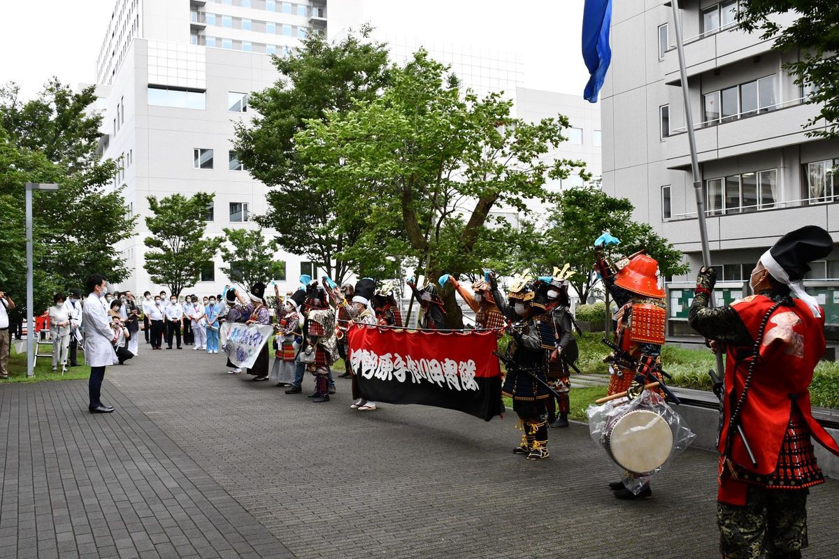 伊勢原キャンパスにある医学部付属病院に7月10日、伊勢原市で活動している愛好家グループ「伊勢原手作り甲冑(かっちゅう)隊」が来訪。甲冑を身にまとった隊員から本病院の医療従事者にエールが送られました。この団体は、同市にゆかりのある室町時代の武将・太田道灌にちなみ、甲冑作りをまちおこしにつなげようと2003年に発足。隊員が厚紙や組みひもなどを使って手作りした甲冑をまとい、さまざまなイベントに参加しています。今回は、新型コロナウイルス感染症と闘う医療従事者らに感謝の気持ちを伝えようと、市内の医療機関などを巡りました。