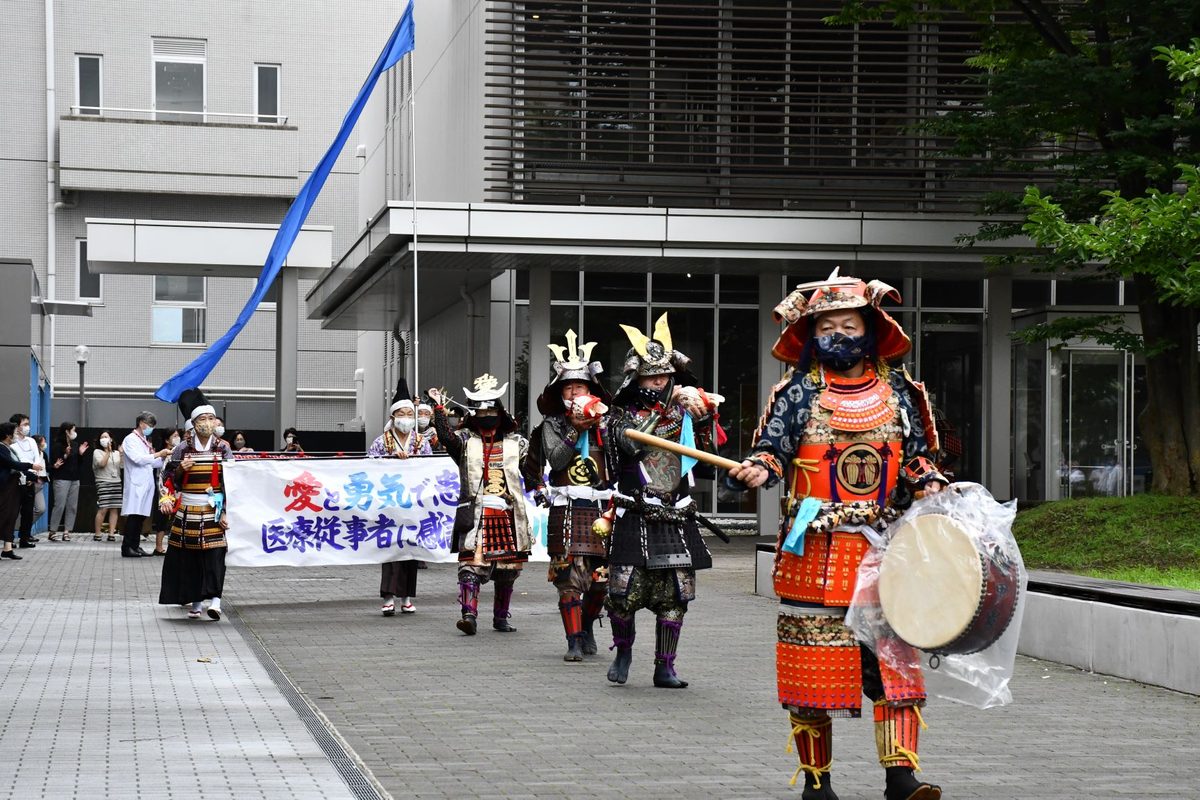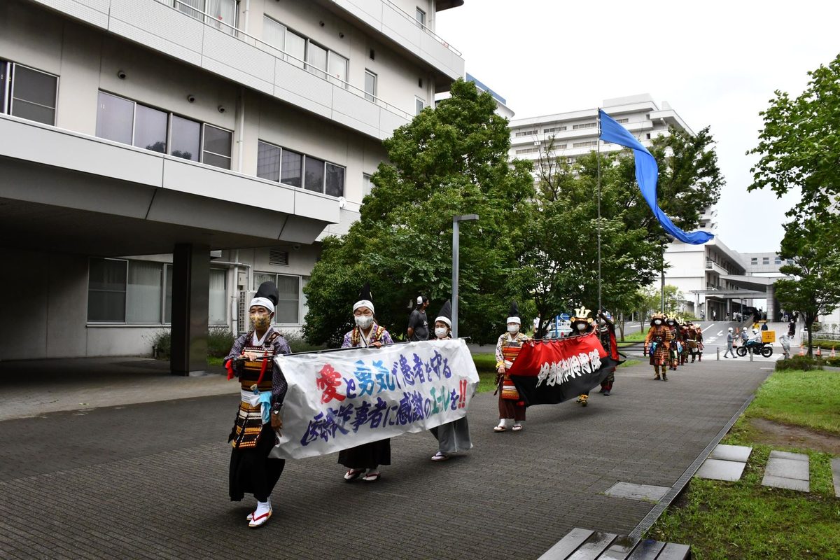 当日は約15名が、戦国武将の出陣を彷彿とさせるほら貝の音とともに登場。本病院の医師や看護師、事務職員らが見守る中、「愛と勇気で患者を守る 医療従事者に感謝のエールを‼」と書かれた横断幕を手に松前記念講堂前の広場を行進しました。続いて代表者が、「日々ご尽力いただき、誠にありがとうございます。これからも私たちの命を守ってくださいますよう、よろしくお願い申し上げます」とあいさつ。隊員が全員で鬨(とき)の声を上げ、エールを送りました。これを受けて本病院の渡辺雅彦病院長(医学部教授)が、「大きな勇気をいただきました。地域に貢献できるよう、これからも努力していきます」と述べました。