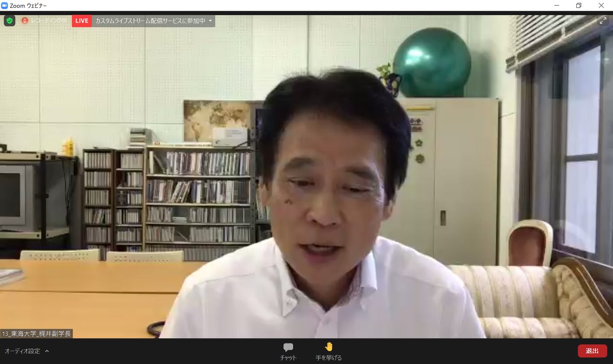 設立総会では、総合地球環境学研究所の山極壽一所長や高橋ひなこ文科副大臣、江島潔経産副大臣、笹川博義環境副大臣のあいさつに続いて、参加機関や各WGの幹事機関が紹介されました。本学の梶井副学長は人材育成WGで紹介を受け、「本学では来年度にゼロカーボン・キャンパスの実行を目指しています。また、以前からSDGsを踏まえた教育に力を入れており、持続可能な社会の実現を目指し、シティズンシップなどの4科目を全学必修科しました。脱炭素社会の実現には地域との連携が必要です。学生が持続可能な社会を創造する一員として、自らの関心や才能を生かして課題解決に参画する医師と力を育むパブリック・アチーブメント型教育を推進することで、それに貢献する人材育成に役立つと考えています」と語りました。