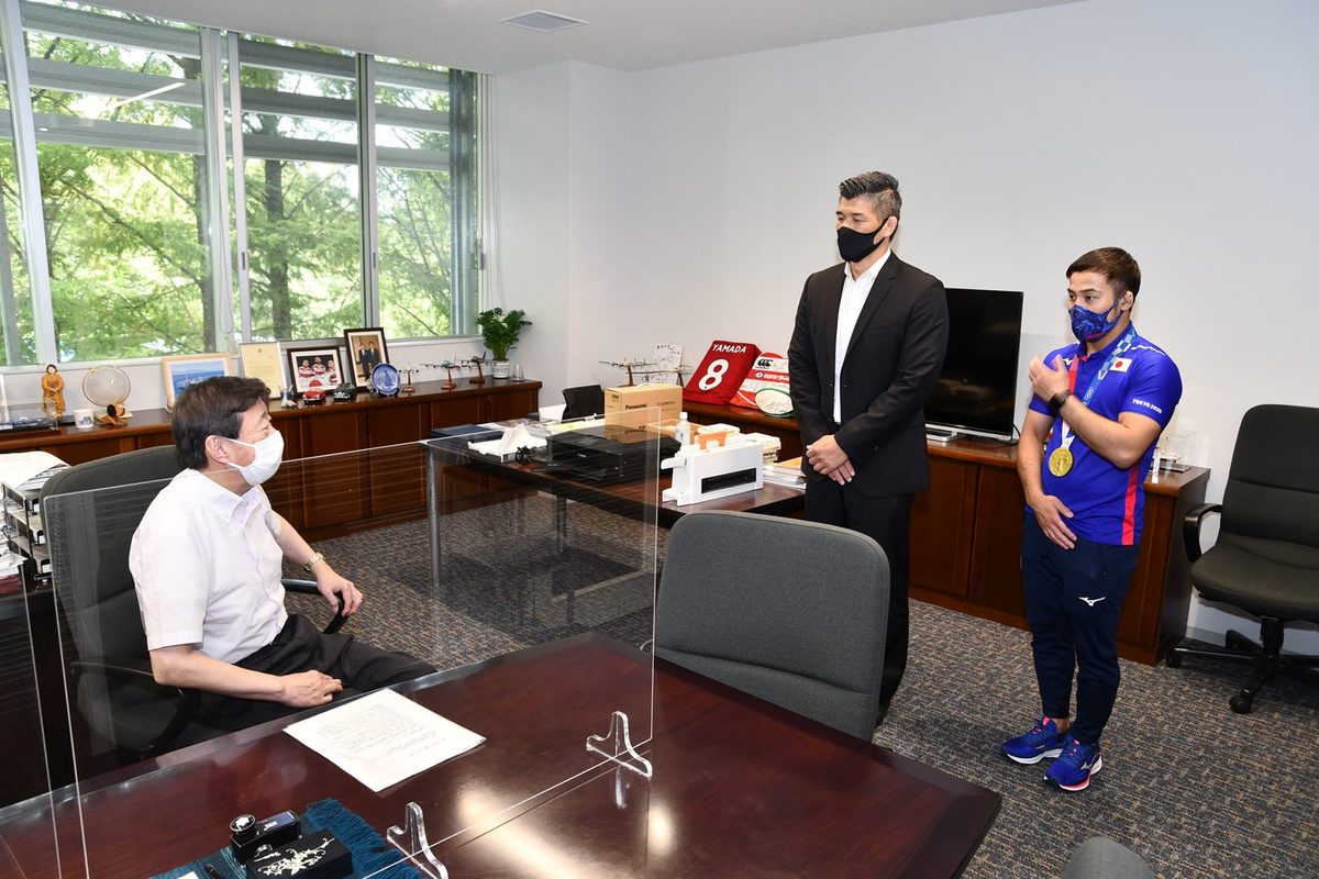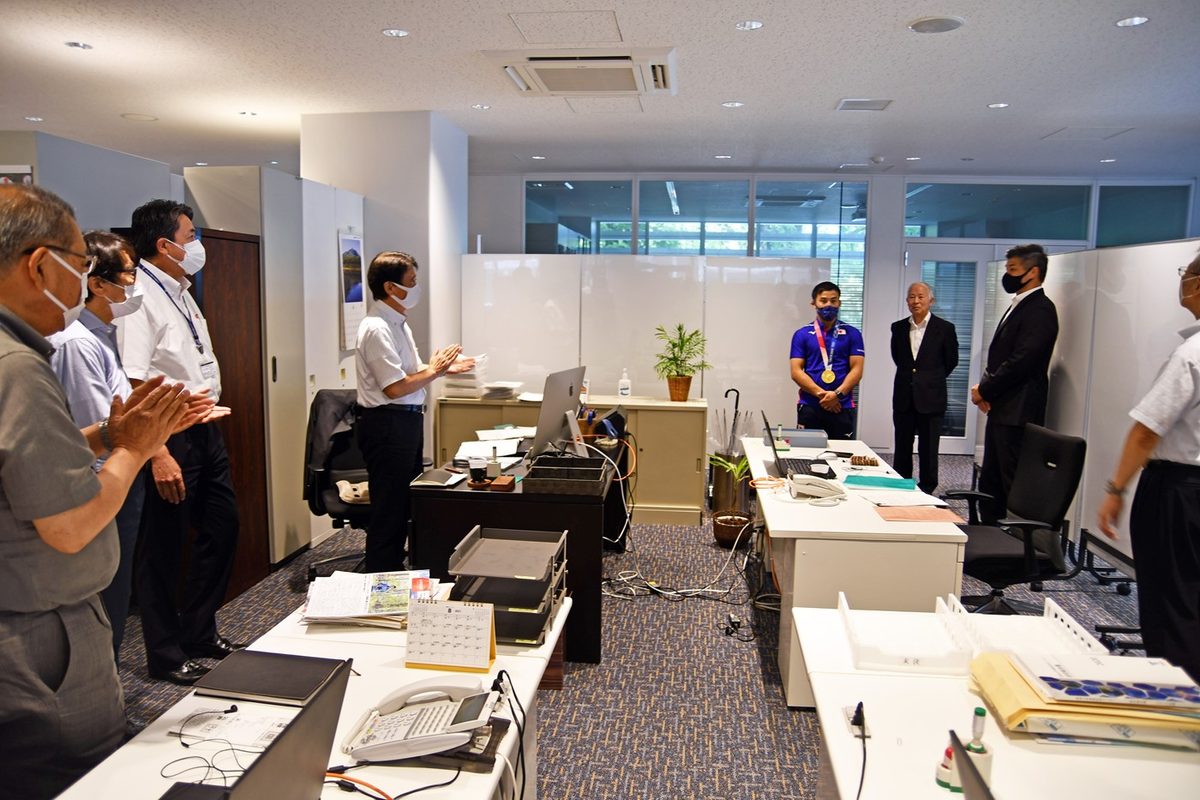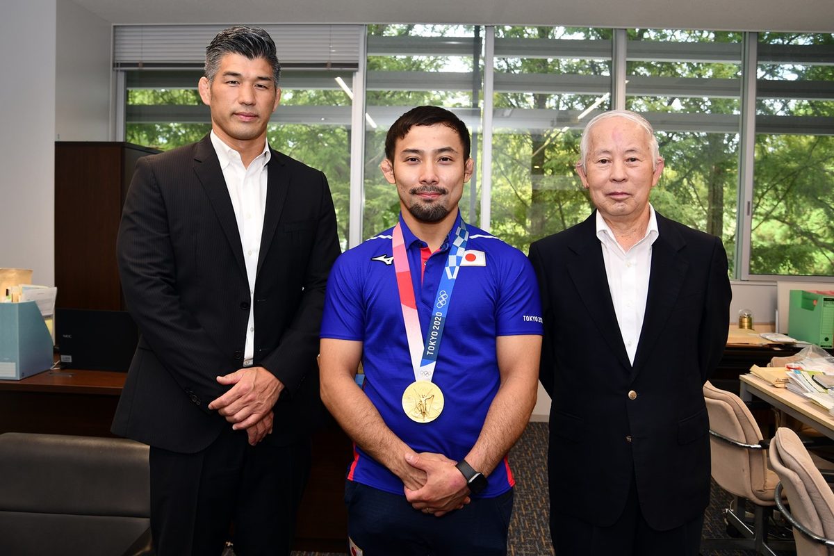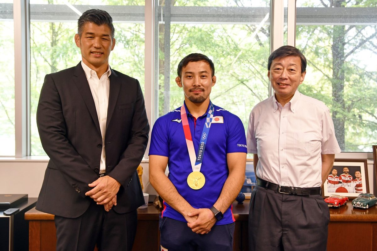 8月25日には井上監督と男子60kg級金メダリストの髙藤直寿選手(2015年度体育学部卒・パーク24)が湘南キャンパスで、山田清志学長と髙野二郎副総長を訪問。井上監督は、「髙藤が日本代表の先陣を切って金メダルを獲得したことで、チーム全体が波に乗れました」と話し、髙藤選手は、「皆さんのおかげで金メダルを獲得することができました。パリ五輪に向けて再び頑張ります」と意気込みを語りました。山田学長は、「髙藤選手が最初に勝ったことで、男子日本代表は過去最多の5つの金メダルを獲得できたのだと思います。コロナ禍が落ち着いたら、あらためてキャンパスでお祝いしましょう」と話し、髙野副総長は、「東京五輪は髙藤選手の金メダルで一気に盛り上がったと感じています。これからも大変だと思いますが、頑張ってください」とエールを送りました。その後も各所で教職員から祝福と拍手が送られました。