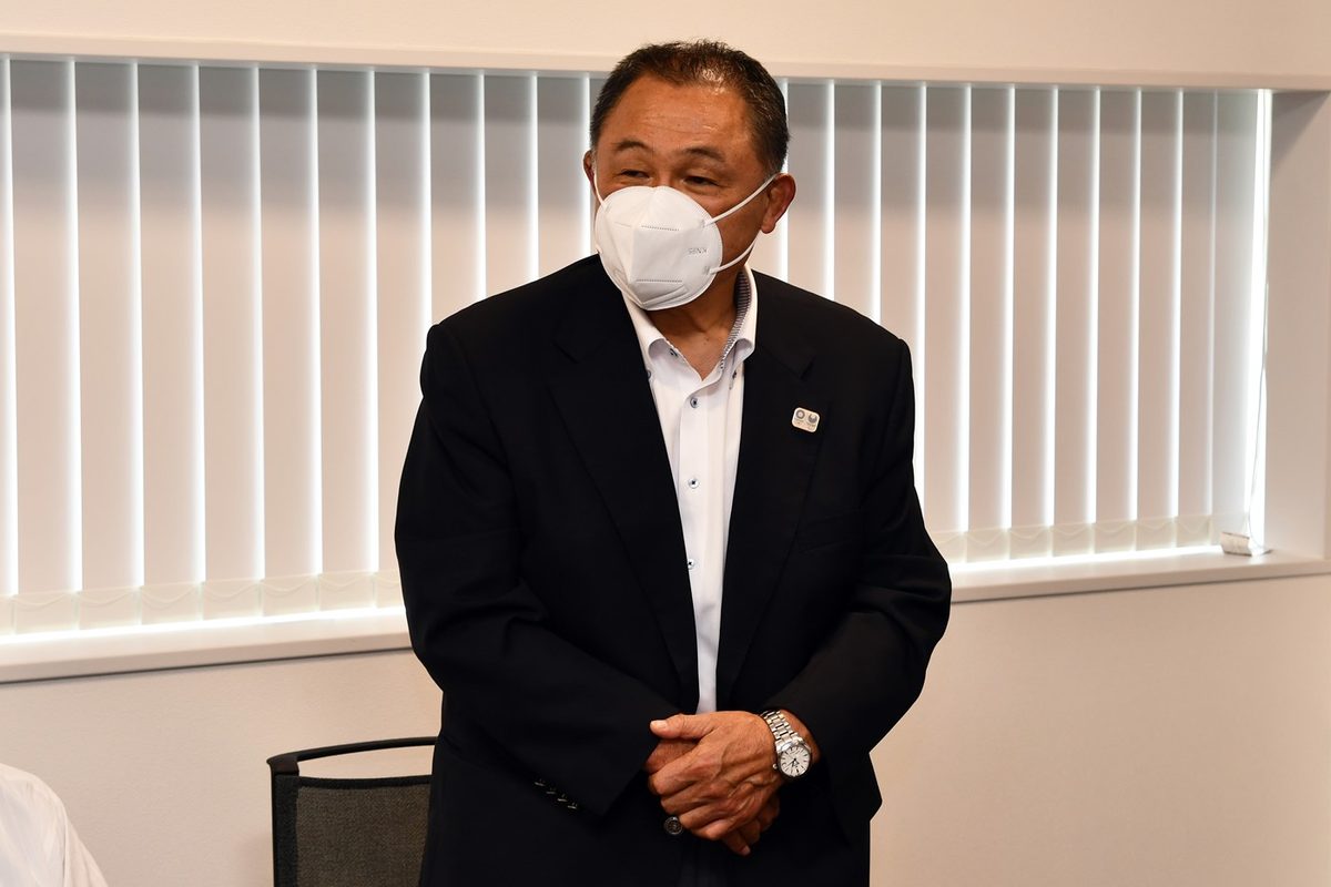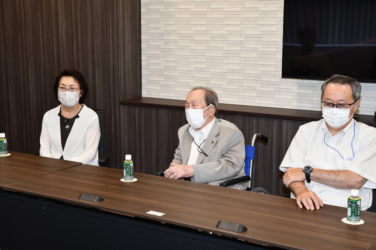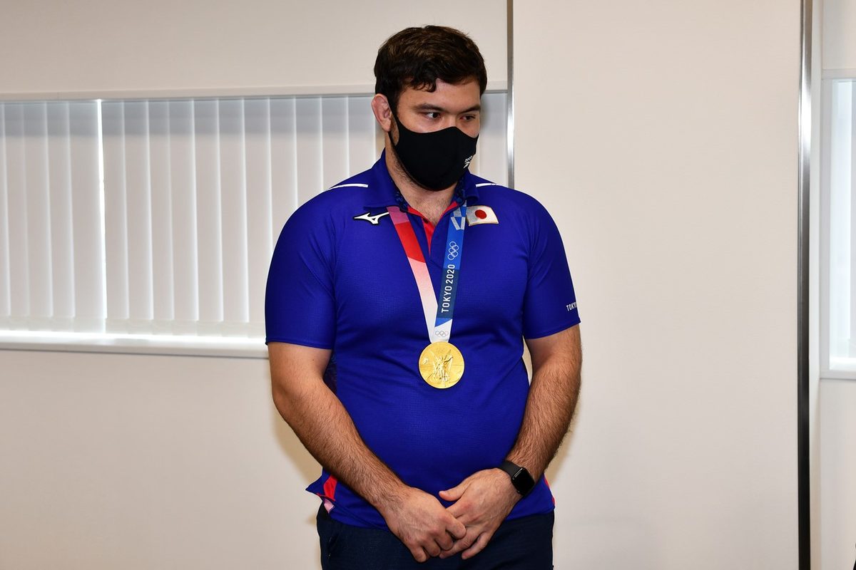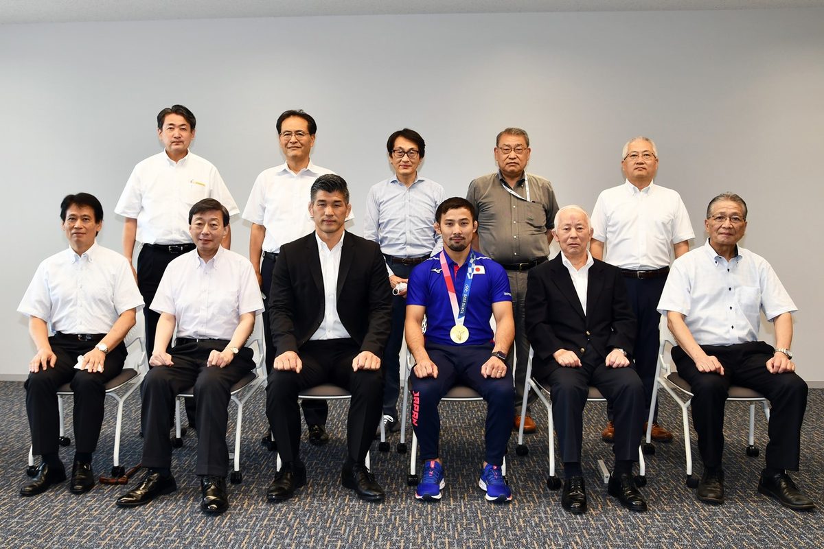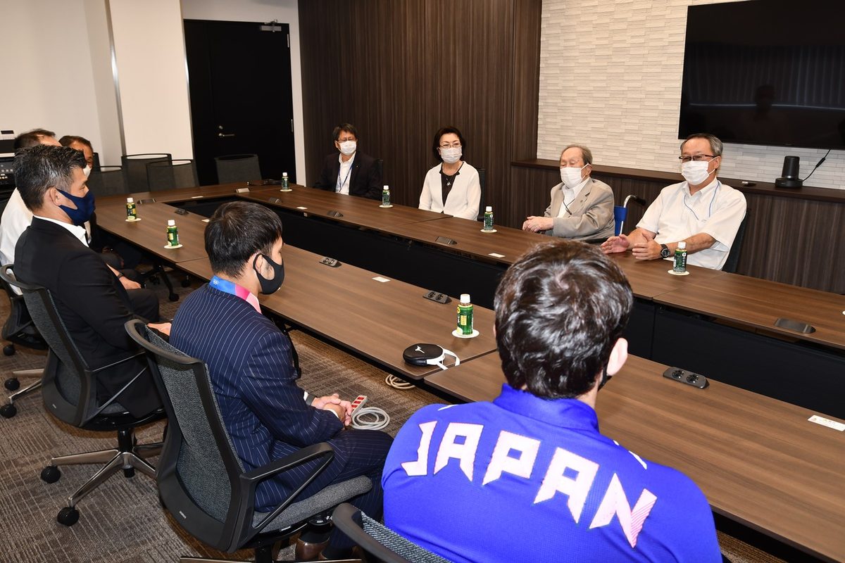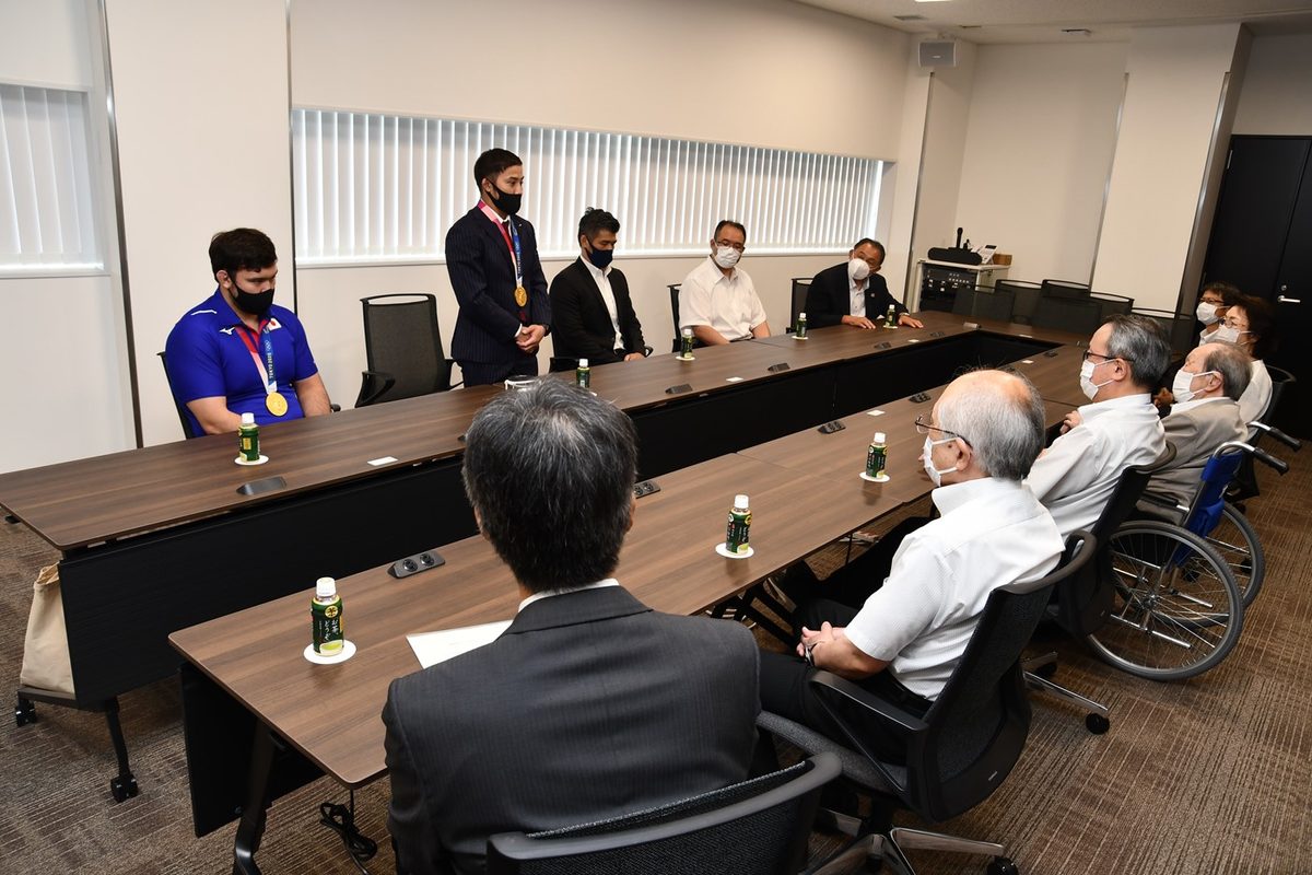 翌26日には山下泰裕副学長(日本オリンピック委員会会長、体育学部教授)と井上監督、男子柔道部の上水研一朗監督(体育学部教授)、髙藤選手、100kg級金メダリストのウルフアロン選手(2017年度体育学部卒・了德寺大学職員)が代々木キャンパスを訪れ、松前達郎総長と松前義昭理事長ら教職員に活躍を報告しました。はじめに山下副学長が、「日本代表全体として金メダル27個を含む計58個のメダルを獲得し、過去最高の成績を収めることができました。柔道に関しては、本日ここにいる全員が付属高校、東海大学出身で、学園の一貫教育の成果であり、松前総長、松前理事長をはじめ皆さんが東海柔道を支援してくださった賜物であると感じています」とあいさつ。続いて井上監督が、「髙藤はリオデジャネイロ五輪で銅メダルに終わった雪辱を果たす素晴らしい試合を展開し、ウルフの100kg級での金メダルは私がシドニー五輪で獲得して以来2人目ということで、また違ったうれしさがありました。2名とも本当によく頑張ってくれました」と語りました。