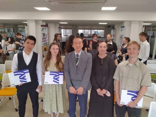 東海大学では7月22日に湘南キャンパスで、複数専攻制度交流プログラムの修了証書授与式を実施しました。このプログラムは、事業責任者で語学教育センターの山本佳男所長(現・工学部長)が2017年度から文部科学省「大学の世界展開力強化事業」の採択を受けて5年間にわたって展開してきた「ライフケア分野における日露ブリッジ人材育成:主に極東地域の経済発展を目的として」プログラムの成果を継承する取り組みです。修了証書を授与されたのは、ロシアのニキフォロフ・ミハイルさん(ロシア国立研究大学経済高等学校)、ボランバイ・ビハンさん(同)、シマニナ・エカチェリーナさん(極東連邦総合大学)の3名です。春学期「日本語教育特別講座」修了式と同時に開催された授与式には、ロシアからの留学生3名が出席。学長室国際担当の山口滋部長(理学部教授)が修了証書を授与しました。