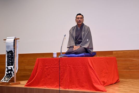阿蘇くまもと臨空キャンパスで11月18日に、近隣の益城町、西原村、大津町の住民の皆さんを招待して古今亭圓菊師匠による独演会「空港となりの落語会」を開催しました。今年4月から新たに開設した本キャンパスを地域の皆さんに披露するとともに、長年にわたって農学部のFD・SD研修などで講師を務めていただくなど親交の深い圓菊師匠の落語を楽しんでもらおうと企画したものです。
