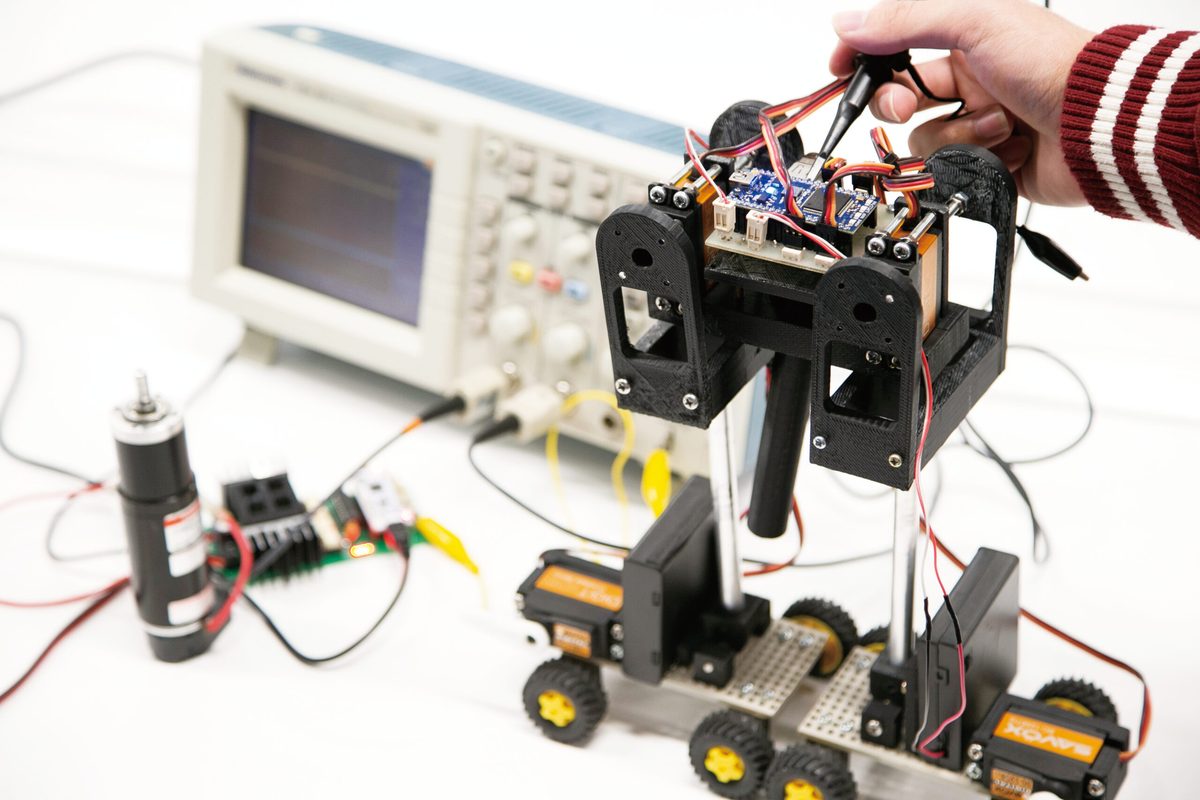 実験・実習科目を多数設けており、教室で学んだ理論を実験室で体験することで、基礎から段階的に技術力を身につけられます。コンピュータシステムやロボットは、日本の産業を支える基幹技術であるだけでなく、ハードウェアとソフトウェアを習得する上で、大変効果的な教材でもあります。ものづくりやロボット製作を通して、実装する喜びとともに高度な実装力を習得します。