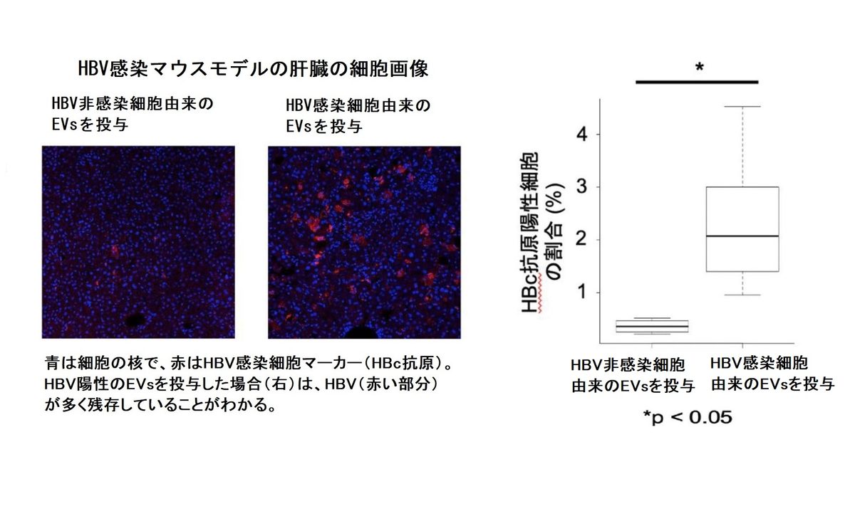 HBVは肝臓に感染して炎症(肝炎)を引き起こし、慢性化(持続感染)により肝硬変や肝がんを発症します。HBVの感染が慢性化すると、感染細胞を排除するための免疫応答に障害が生じることがわかっていますが、障害発生のメカニズムは解明されていません。研究グループは、がん細胞や免疫細胞などさまざまな細胞から放出されて全身の細胞に情報を伝達する細胞内小胞(EVs)に着目。ハイドロダイナミックインジェクション法(生体内に直接、短時間でDNAを導入する方法)でHBVに感染させたマウスモデルを用いた実験により、HBV感染細胞由来のEVsを投与すると、細胞内のHBVが排除されずに残存することを明らかにしました。また、ウイルスを攻撃して除去する役目を持つCD8+T細胞の働きを阻害する免疫チェックポイント因子PD-L1が、免疫機能をコントロールする樹状細胞の膜上に増加することも確認。さらに、HBV感染細胞由来のEVsが肝臓から骨髄に取り込まれ、EVsを取り込んだ骨髄細胞が腸管に集積しやすくなることも突き止めました。
