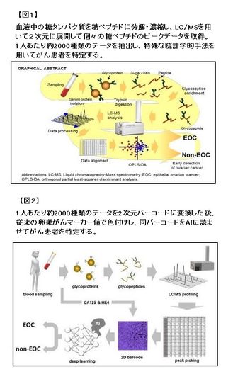 研究グループでは、既成概念を打破する新たな発想とアプローチで新規腫瘍マーカーの探索と診断法の研究に取り組み、液体クロマトグラフィー質量分析(LC/MS)による「網羅的血清糖ペプチドスペクトラ解析(CSGSA:シースジーサ)」を開発しました。CSGSAは、血液中の糖タンパク質を糖ペプチドに分解・濃縮してLC/MSに投入し、卵巣がん陽性の場合に高い値(ピーク)を示し、かつ再現性のある約2000種の糖ペプチドを抽出して分析するシステムです。抽出した2000種のピークデータを患者間で比較して単一の腫瘍マーカーを同定するとともに、個々の病態を判別できます。CSGSAに統計学的解析法(OPLS-DA法)や人工知能(深層学習)を応用し、2000種のピークデータを2次元バーコードに変換後、パターン化(色付け・可視化)して初期卵巣がんを診断する2つのアルゴリズムの開発にも成功しました。