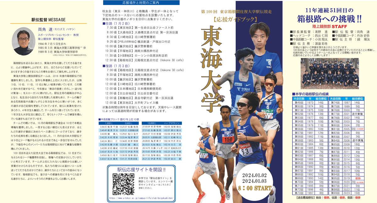 100回の節目を迎えた記念大会である今回の箱根駅伝を、復権への足掛かりにしたいと考えています。チームが上位に入れないときは周囲から厳しい言葉がかけられるものですが、私たちの周りには温かいエールを送ってくださる方ばかりであり、選手たちにとって日々の励みになっています。箱根駅伝でも、皆さまへの感謝を形にするべく力走する選手たちに、よりいっそうのご声援をよろしくお願いします。