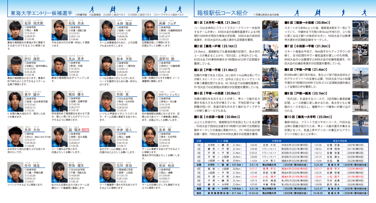 東京箱根間往復大学駅伝競走(箱根駅伝)は、東京・大手町から箱根・芦ノ湖間の往路5区間(107.5Km)、復路5区間(109.6Km)の合計10区間(217.1Km)で競う、学生長距離界最大の駅伝競走です。今年は第100回の記念大会。参加チームは前回大会でシード権を獲得した上位10校と、予選会を通過した13校、合計23校となります。大学三大駅伝と称される「出雲駅伝」「全日本大学駅伝」と比較すると、その最大の特長は1区間あたり20㎞を超える距離の長さと、山上り・山下りと形容される5区と6区の特殊区間です。特殊区間を含む長丁場の10区間を担う選手層の厚さとチームの総合力が問われる大会となっています。