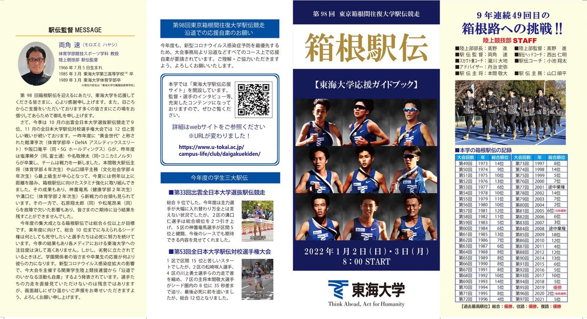 今回の箱根は、沿道での応援が3年ぶりに解禁されます。学園関係者の皆さまや卒業生の応援が選手たちにとって何よりの力になりますし、皆さまに選手たちの力走を直接見ていただけることを大変うれしく思います。主催する関東学生陸上競技連盟からは、「沿道で観戦、応援する際はマスクを着用し、周囲との距離を確保してください。また、声を出しての応援は控えてください」との要請もありますので、ルールを守った上で、選手たちに温かいエールをお寄せいただきますよう、よろしくお願い申し上げます。
