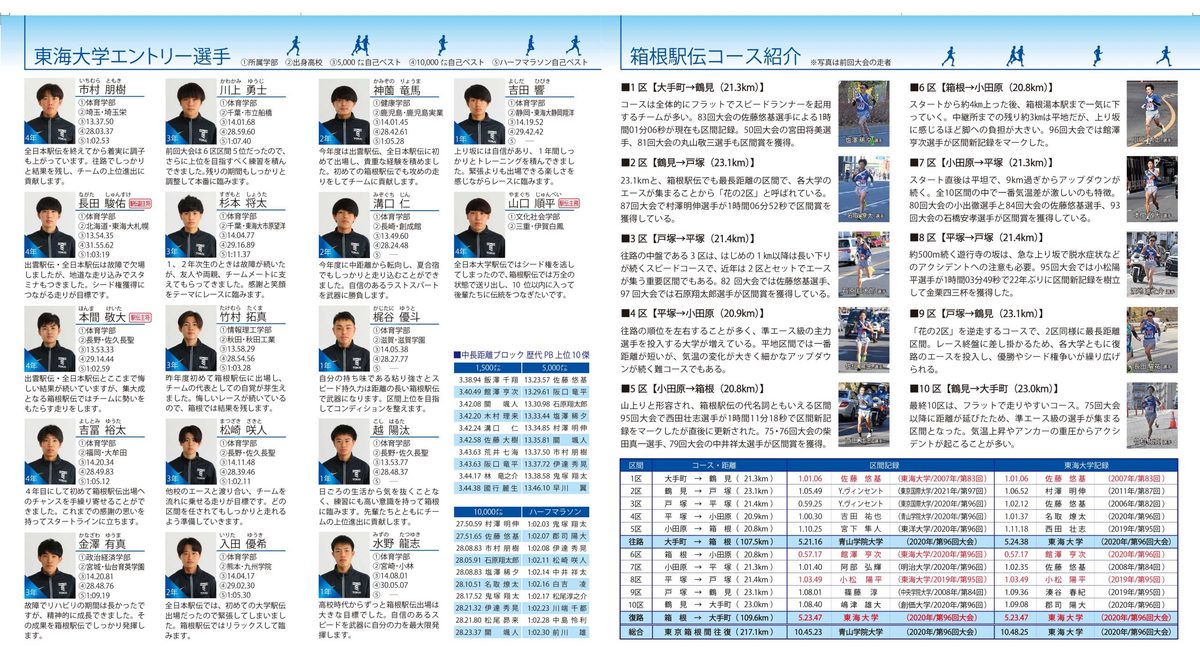 東京箱根間往復大学駅伝競走(箱根駅伝)は、東京・大手町から箱根・芦ノ湖間の往路5区間(107.5Km)、復路5区間(109.6Km)の合計10区間(217.1Km)で競う、学生長距離界最大の駅伝競走です。参加チームは前回大会でシード権を獲得した上位10校と予選会を通過した10校、関東学生連合を加えた合計21チームとなります。大学三大駅伝と称される「出雲駅伝」「全日本大学駅伝」と比較すると、その最大の特長は1区間あたり20㎞を超える距離の長さと、山上り・山下りと形容される5区と6区の特殊区間です。特殊区間を含む長丁場の10区間を担う選手層の厚さとチームの総合力が問われる大会となってます。