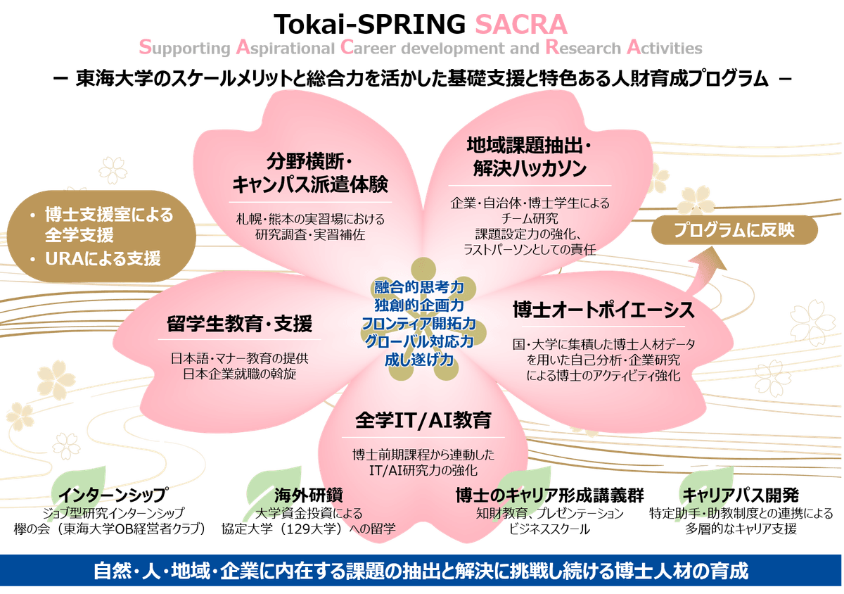 本学は、本事業の採択を受け、「総合力で未来創造に挑み続ける博士人財育成プログラム」(Tokai-SPRING SACRA)の運用を開始し、インターンシップ・海外研鑽などキャリア形成の支援、また東海大学のスケールメリットを活かした分野横断キャンパス派遣体験など独自のプログラムを提供します。