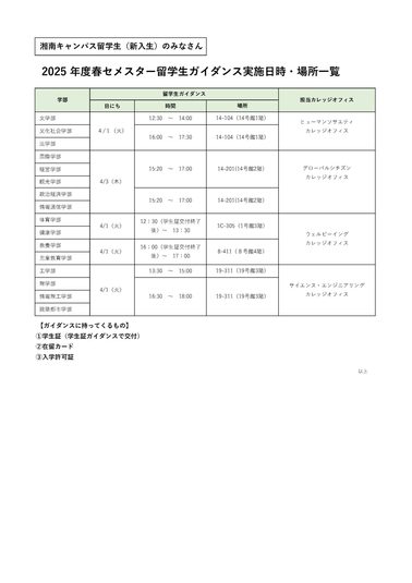 日時・場所:以下の「2025年度春セメスター留学生ガイダンス実施日時・場所一覧」でご確認ください。