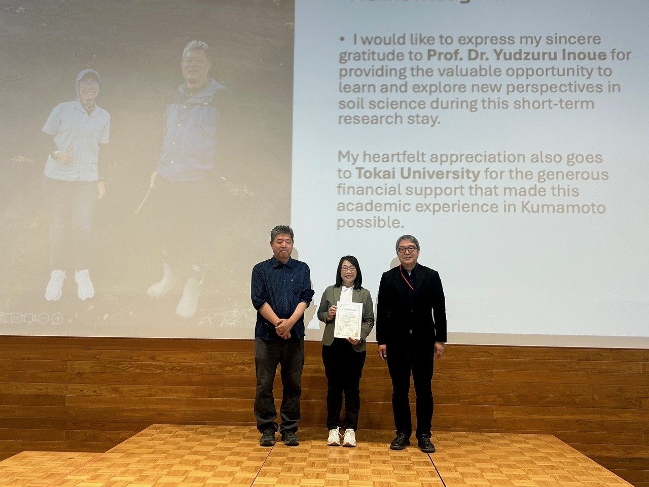 農学部農学科の土壌学研究室(井上 弦 教授)において、 緑川水系の富合町における水田から施設園芸に転換された農地の土壌特性について調査され、その調査結果や滞在期間中に身につけられた技術について報告をなされました。