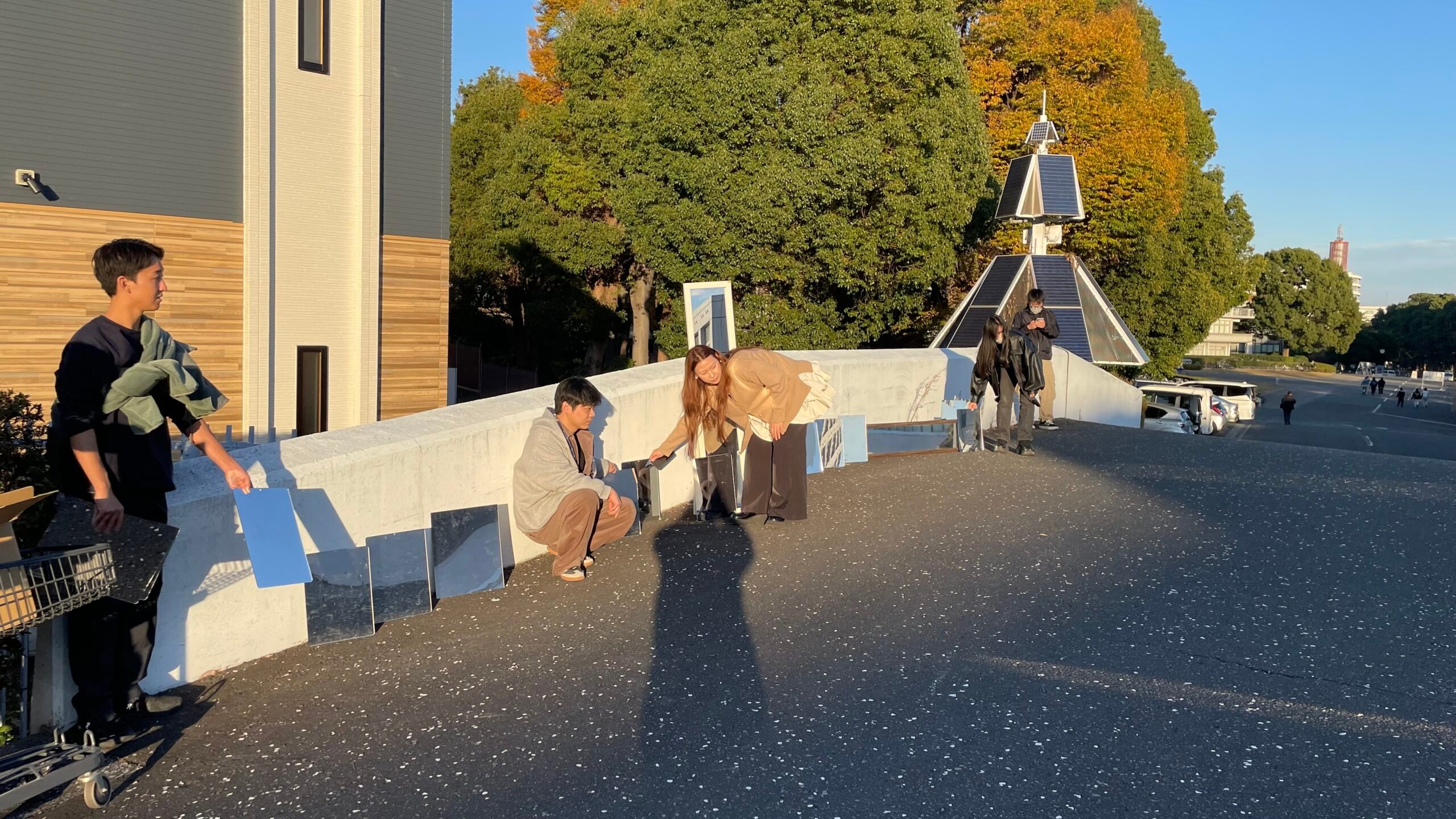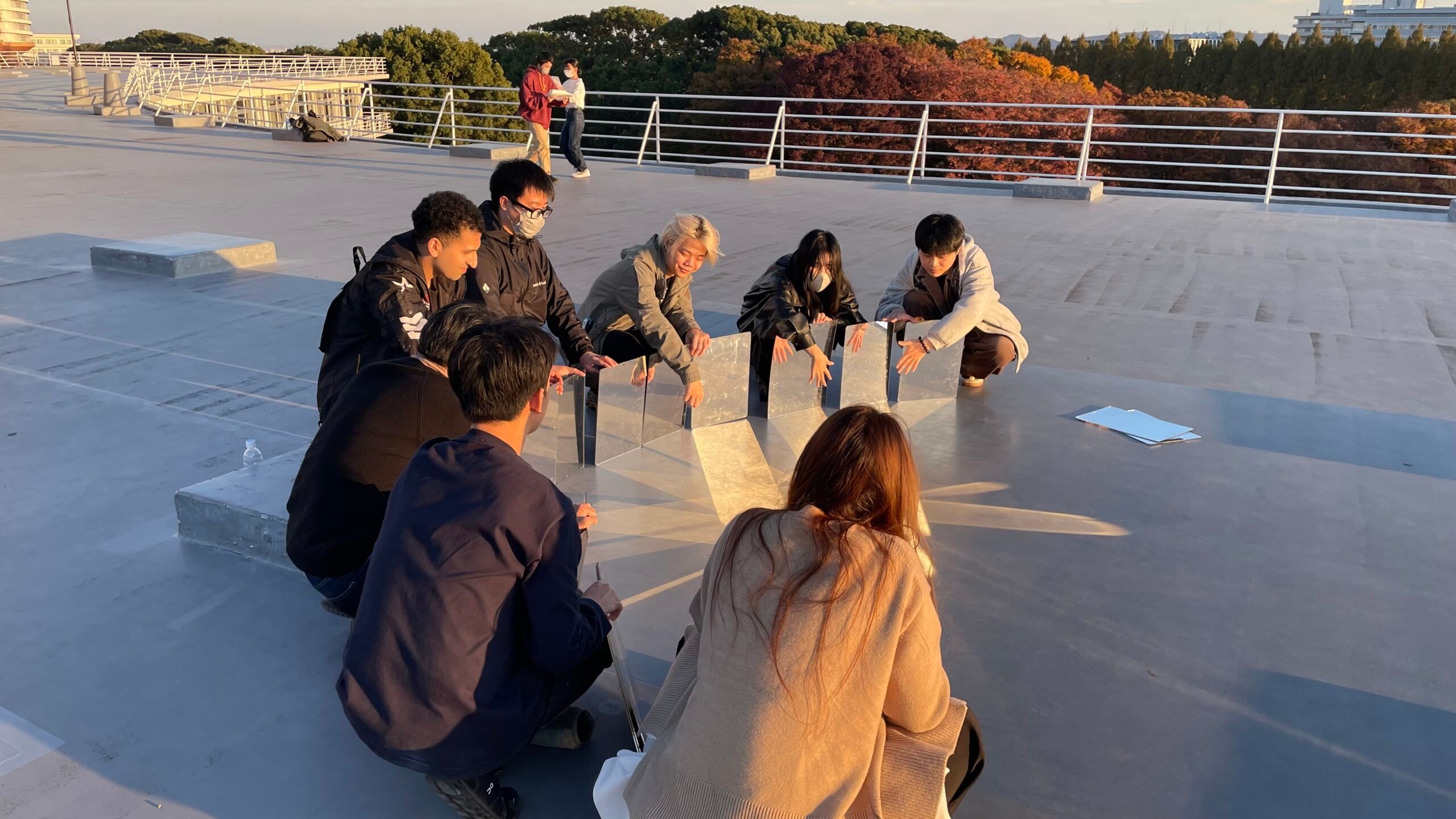 大学院授業科目:造形芸術特講では、大学にある鏡を集めて、日光を反射させた造形の実験を行いました。絵画や彫刻、デザイン、写真、映像を学ぶ大学院生たちで、太陽の光を反射させて、影の部分に当て、橋の欄干を光らせてみたり、1号館の屋上で光の交信を試みたり、円形にして光線と鏡による造形制作など、いろんな実験を行いました。