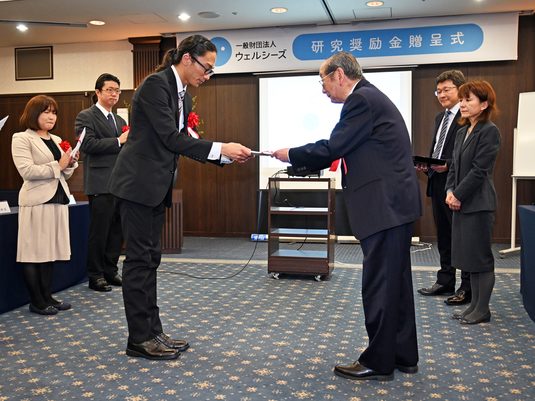 大学院生物科学研究科生物科学専攻3年次生の富永悠幹さんがこのほど、熊本県内の若手研究者の基礎研究を奨励する一般財団法人「ウェルシーズ」の「2023年度研究奨励金」受賞者に選出。2月15日にホテル熊本テルサで行われた贈呈式に富永さんと指導教員の永井竜児教授(農学部食生命科学科)が出席しました。贈呈式では井出博之代表理事から5名の受賞者に目録が手渡され、それぞれ研究概要をプレゼンテーション。来賓祝辞としてあいさつした東海大学学長付の荒木朋洋教授(総合農学研究所)は医学部生と共に研究に励んだ学生時代を振り返り、「当時は臨床が主流で、基礎研究は何の役に立つのかと言われていました。しかしそれから40年が経つ今、まさにその基礎研究が花を開き、さまざまな成果が生まれています。皆さんの研究が将来必ず役に立つことを期待しています」と語りました。
