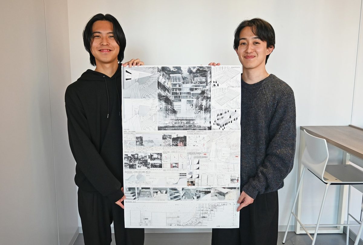 建築都市学部建築学科の野口直人講師の研究室に所属する後藤龍之介さん(2年次生)と佐々木優さん(1年次生)は、「百段階段を崩す〜横浜の記憶とまちを紡ぐブラフの新たな階段劇場〜」で11位となりました。1859年の横浜港開港時に現在の関内・山下町に外国人居留地ができ、立ち退き命令によって強制移住させられた住民たちが元町に作った百段階段を現代に生まれ変わらせる作品です。当時の階段の上には浅間神社があり、もともと住んでいた村を眺められる場所でもあったと言います。学生たちは、「昔そこにあったものの魅力をアップデートして建築に生かしたいと考えました。小さな段差から徐々に幅を広くして変化を与え、登るための階段から新しい居場所になるような設計にしました」と話します。中央の階段は結婚式場とし、両側にはジュエリーや洋服、花などの店舗を設けるとともに、空間全体をホールとして活用する提案もしました。「百段階段が関東大震災で壊れ、後に少し離れたところに電車の駅ができて、人の流れが変わってしまいました。以前、この土地が女性ファッションの発信地だったように、憧れられる場所にしたい」と狙いを語りました。