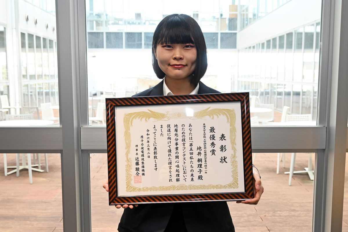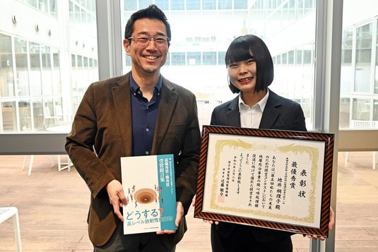 大学院工学研究科応用理化学専攻1年の地井桐理子さんがこのほど、原子力発電環境整備機構(NUMO)が主催する「第5回私たちの未来のための提言コンテスト」で最優秀賞を受賞。3月2日に東京都・日本科学未来館で表彰式が開かれ、地井さんと指導教員の若杉圭一郎教授(工学部応用化学科)が出席しました。日本では「特定放射性廃棄物の最終処分に関する法律」によって高レベル放射性廃棄物は地層処分すると決められていますが、制定から20年以上が経過した現在でも処分地は決定していません。コンテストは、地層処分を進めるにあたり将来的に世論形成の中核となる次世代層に関心を持ってもらうことなどを目的に開かれています。世代別の2部門に計198編の応募があり、地井さんは「地層処分が抱えるコミュニケーション的課題と、当事者意識を生むためのきっかけづくりの提案」というタイトルで応募し「高専4年生以上・大学生・大学院生」部門の最優秀賞に輝きました。