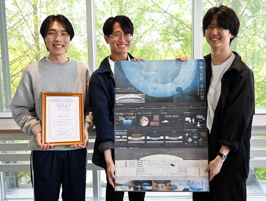 大学院工学研究科建築土木専攻2年次生の2チーム(指導教員=岩﨑克也教授・建築都市学部学部長)がこのほど、「第10回宇宙建築賞」で銀メダルと銅メダルを受賞しました。同賞は、本学建築都市学部建築学科の十亀昭人教授がキュレーターを務め、宇宙飛行士の山崎直子氏や宇宙ビジネスの専門家らの協力を得て実施されており、宇宙建築の周知とアイデアの振興、発信などを目的に開催されています。今年度は「宇宙ビジネスと建築」がテーマで、3月15日に東京都港区の建築会館で表彰式が行われました。