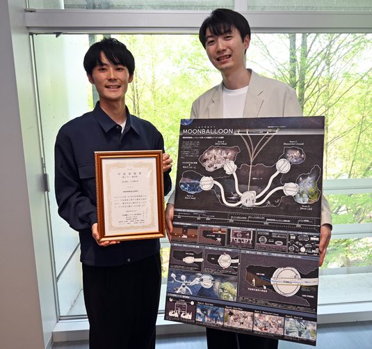 銀メダルを受賞したのは都丸優也さんと大石真輝さんの作品「MOONBALLOON 風船型探査機ムンバルンを用いた月面縦孔ビジネスの提案」です。2名は月にあるマリウスヒル縦孔の中には小さな洞窟が複数存在しているのではないかと仮定し、「探査」と「滞在」の2つのフェーズで提案しました。今回2名が考案した風船型探査機(愛称:ムンバルン)を小さな洞窟の入り口に差し込み、チューブから送り込んだ空気で探査機本体を膨らませて入り口をふさぎ、その後、密閉した洞窟内に空気を充填させることで、宇宙服が不要な空間を生み出せる可能性を示しました。各洞窟は探査過程を終えると“月のワンルーム”として研究室や企業のオフィス、居住空間として活用される計画です。「ムンバルンは内外2層構造で宇宙服のようなソフトな素材を外層に使用することで、洞窟の凹凸形状に密着固定できるのではないかと考えました」と大石さん。都丸さんは、「宇宙服が不要な空間になれば、五感を使ってより詳細な調査・研究が可能になります。探査機の開発資金は寄付で集め、支援者には見返りとして月のワンルームのオーナー権を譲渡し、宇宙ビジネスに取り組む企業に部屋を貸し出して賃貸料を得るなど、ビジネスサイクルも考案しました」と話しました。最後に2名は、「今回のコンペを通じて、二人で楽しみながら宇宙に関する新しい知識や発見を得られました。議論を重ねた提案に対して評価をいただきとても嬉しいです」と語りました。