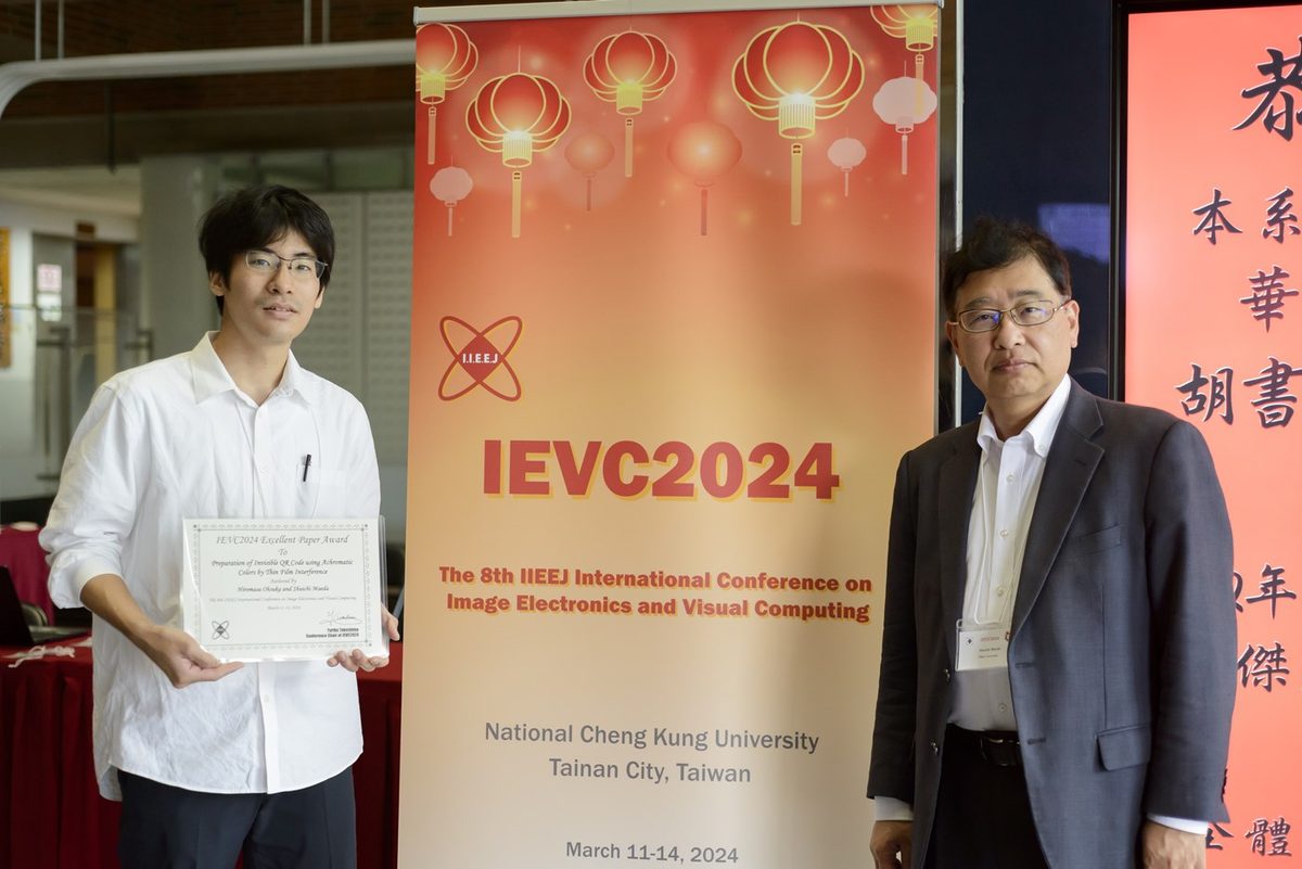 大学院工学研究科電気電子工学専攻2年次生の大須賀博雅さんが3月11日から14日まで、台湾・成功大学で開催された「第8回画像エレクトロニクスとビジュアルコンピューティングに関する国際会議」(主催:一般社団法人画像電子学会)で優秀論文賞を受賞しました。同会議は、写真および関連する分野の研究について発表し、知識の交換、情報の提供の場とすることなどを目的に開かれたものです。大須賀さんは「薄膜干渉によって得た無彩色を用いた不可視QRコード」をテーマに1分間のプレゼンテーションとポスター発表に臨んだ成果が評価されました。
