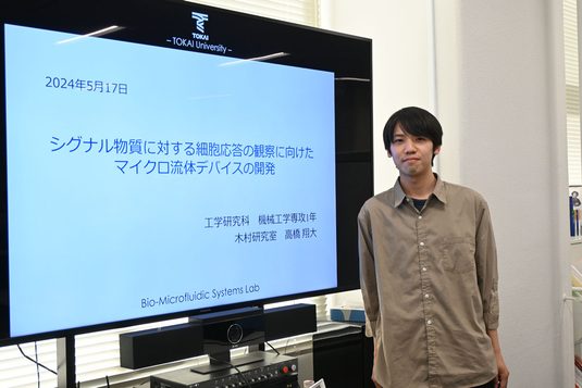 高橋さんの発表テーマは、「シグナル物質に対する細胞応答の観察に向けたマイクロ流体デバイスの開発」です。研究の背景には、少子化の一つの要因ともされる男性不妊症について、その主たる原因である精子形成障害の早期発見・治療の方法を確立するために待たれる精子形成のメカニズムの早急な解明があります。精子の元であり、自らも増殖する精子幹細胞は、生体内で濃度が変動するシグナル物質にさらされていることは知られていますが、その応答については不明です。そこで高橋さんは、細胞の応答を詳細に観察することのできるシステムの開発を目指して研究を進め、これまで木村教授の研究室で進められてきたマイクロ流体システムを応用し、送液などを安定させることでシグナル物質の長周期的な濃度変化を再現可能な「2層型流路デバイス」の実現を試みてその経緯を発表。高い評価を受けました。