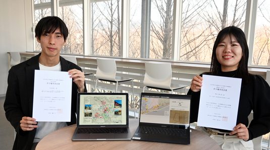 大学院工学研究科建築土木工学専攻1年次生の荒石菜々美さんと生島駿大さんが、昨年8月28日から30日まで行われた2024年度日本建築学会大会学術講演会に参加。このほど審査結果が発表され、荒石さんが建築歴史・意匠部門で、生島さんが都市計画部門で、それぞれ若手優秀発表賞を受賞しました。