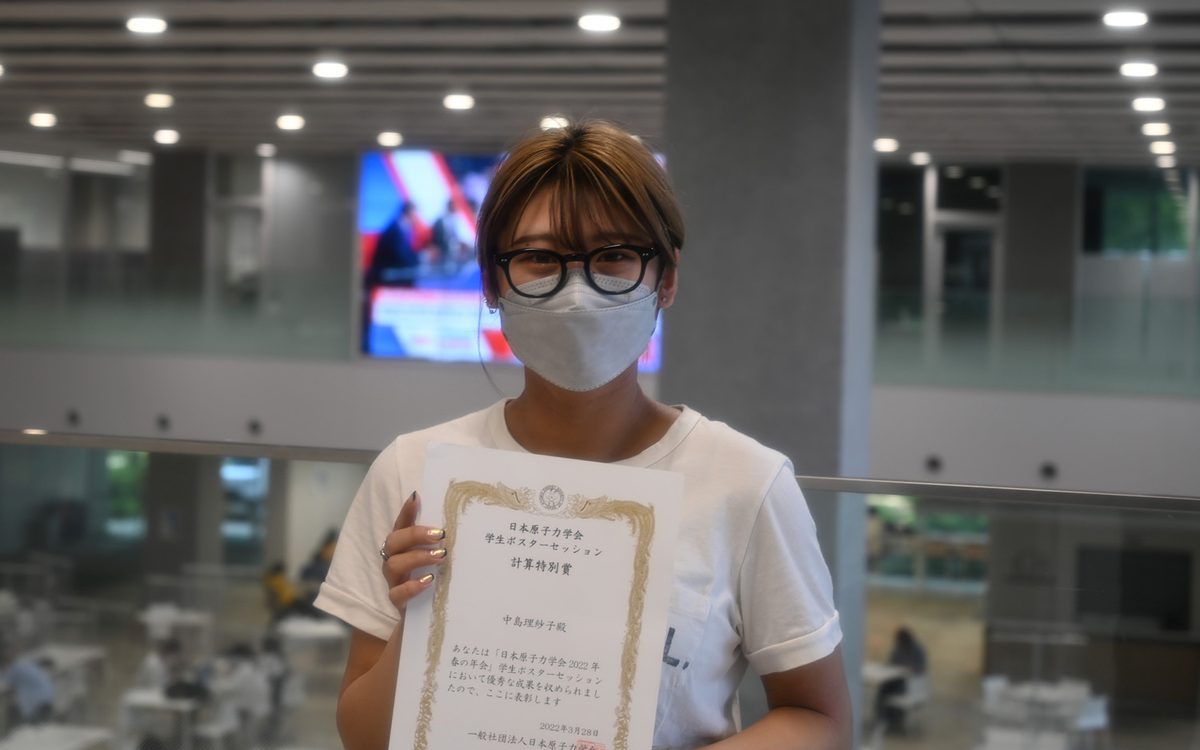 大学院工学研究科応用理化学専攻(原子力領域)修士2年の中島理紗子さん(指導教員=工学部機械工学科・堺公明教授)が、3月16日から18日にかけてオンラインで実施された「日本原子力学会2022年春の年会」の学生ポスターセッションで、「計算特別賞」を受賞しました。中島さんは、昨年度の春の年会でも「積雪ハザードによるリスクの定量化に関する調査」のテーマで奨励賞を獲得しており、今回で2年連続の受賞となりました。同学会は、「春の年会」「秋の大会」を開催しており、今回は全国の学生や大学院生ら68名が研究成果を発表しました。