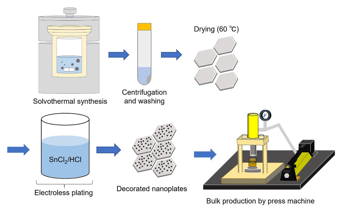 高尻教授の研究室ではこれまで、熱変換材料の一つである正六角形型で単結晶の「ビスマス・テルルナノプレート」の生成方法を解明していましたが、さらに性能を高める加工方法は明らかになっていないため、小橋さんはナノプレートの熱伝導率を下げる新たな加工方法を発見しようと、4年次生のころから研究を重ねてきました。熱の流れを妨げるためには、材料に障害物を付着させる必要があり、実験の結果もっとも熱伝導率を下げる効果があった錫に着目。さまざまな濃度の塩化錫の水溶液を使って、ナノプレートに無電解メッキで錫ナノ粒子を付着させました。その後プレス機で圧縮して、厚さ0.6ミリの多結晶のナノプレートを作って熱伝導率を調べると、濃度90ミリモルの塩化錫水溶液を使ったナノプレートは、加工していない多結晶ナノプレートに比べて、熱伝導率が約30パーセント低下したことがわかりました。