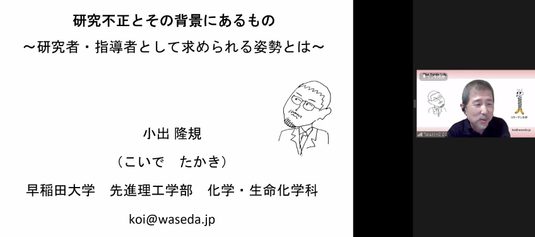 大学院健康科学研究科看護学専攻と本研究科FD委員会が9月14日に、教員を対象とした研究不正防止に関する特別講演会をオンラインで開催しました。研究倫理に対する意識を高めるとともに、公正な研究活動の推進・指導を徹底するために実施したものです。早稲田大学先進理工学部化学・生命化学科教授の小出隆規氏が、「研究不正とその背景にあるもの―研究者・指導者として求められる姿勢とは―」をテーマに講演し、本研究科をはじめ医学部看護学科や健康学部健康マネジメント学科、医療技術短期大学の教員ら約50名が聴講しました。