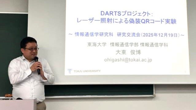 第一部のハイライト発表では、大東俊博教授が、高山佳久教授・山本宙教授らと共同で進めている「DARTSプロジェクト:レーザー照射による偽装QRコード実験」について講演を行いました。講演では、プロジェクトを立ち上げた背景、情報セキュリティに関する基礎的な考え方、QRコードの構造と仕組み、誤り検出・訂正技術の要点、さらに今後の研究展開に向けた構想が順を追って説明されました。後半にはレーザー照射による実演が行われ、参加者は自身のスマートフォンを用いてQRコードを読み取ることで、偽装の現象を実際に体感することができました。会場には、理論と実演が結びついた内容に対して強い関心を寄せる様子が見られました。