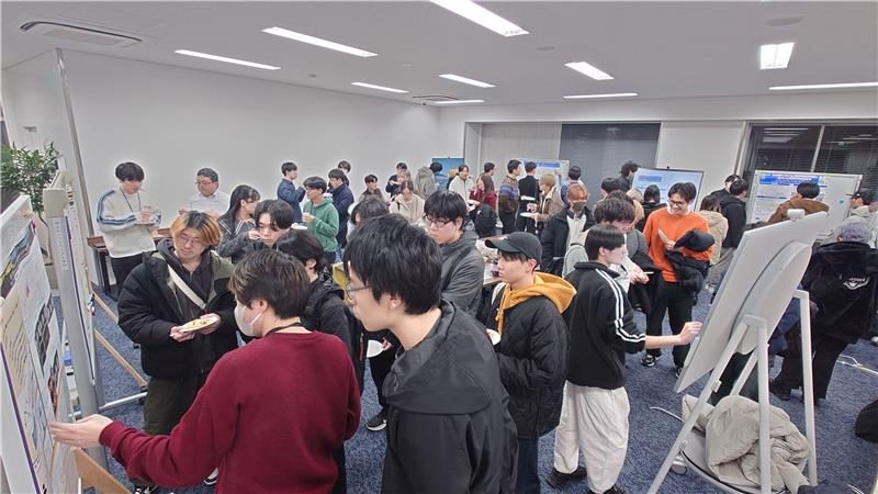 続く第二部では、教員・大学院生・卒研生らによる多様な研究テーマのポスター発表が行われました。会場では、参加者が資料や画面を参照しながら発表者と積極的に議論を交わし、それぞれの研究内容や方法論、応用可能性について理解を深めていました。学生主体の取り組みに教員の専門知が交わることで、研究科ならではの活気ある交流の場が形成され、終始にぎやかな雰囲気の中で学術的な対話が発展していきました。