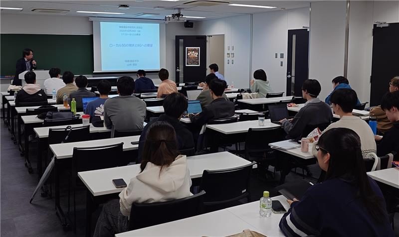 海上輸送に関するデータサイエンスの研究も、フランスで研究を行うための奨学金の話も、初めて聞くことばかりでしたが、参加した教員と学生はみな興味を示し、活発な質疑が行われました。内部の研究者による講演とは違い、異なる研究分野と視点からの話を聞くことができ、とても良い研究交流会になりました。今後も外部の研究者をお迎えして研究交流会を開催する予定です。