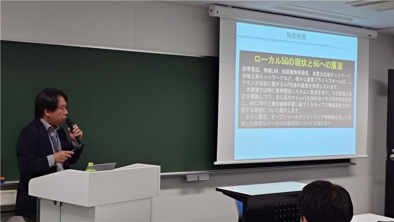 山崎准教授は、近年注目を集める無線通信技術の全体像を概説し、特にローカル5Gについては、品川キャンパス内で実施した性能評価の結果をもとに、具体的かつ実践的な知見を共有されました。講演では、実測データに基づいた詳細な分析が紹介され、会場では技術的な観点から活発な議論が交わされました。