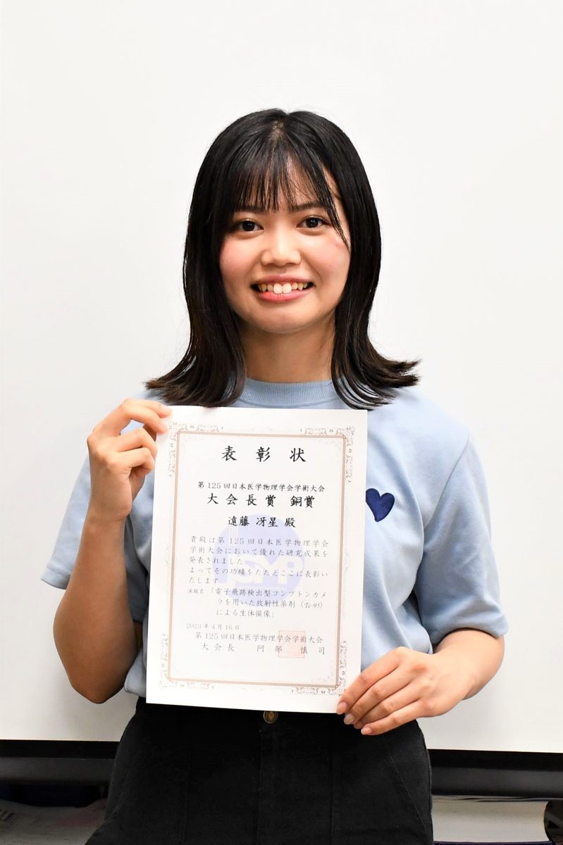 大学院医学研究科医科学専攻(修士課程)2年次生の遠藤冴星さん(理学部物理学科卒)が、4月13日から16日までパシフィコ横浜で開催された第125回日本医学物理学会学術大会で、「電子飛跡検出型コンプトンカメラを用いた放射性薬剤(Tc-95)による生体撮像」をテーマに研究成果を発表。「大会長賞 銅賞」を受賞しました。