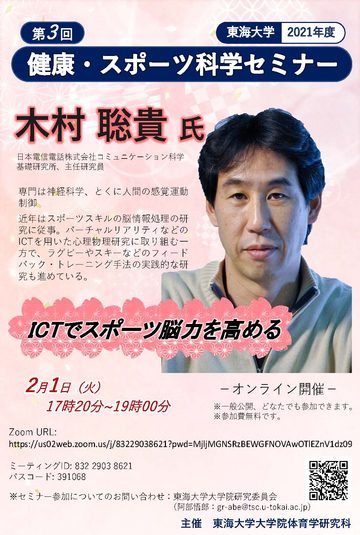 2月1日(火)に東海大学大学院体育学研究科主催で「ICTでスポーツ脳力を高める」と題して木村総貴氏(日本電信電話株式会社コミュニケーション科学基礎研究所、主任研究員)を招き『第3回健康・スポーツ科学セミナー』を開催します。