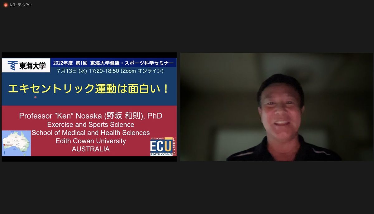 大学院体育学研究科では7月13日に、「2022年度第1回健康・スポーツ科学セミナー」をオンラインで開催しました。このセミナーは、学内外から健康やスポーツ科学の専門家を招き大学院生や教職員に知識の幅を広げてもらおうと、年に4回開催しています。今回はオーストラリア・エディスコーワン大学教授の野坂和則氏が「エキセントリック運動は面白い!」をテーマに講演し、大学院生、体育学部などの学生、教員ら約50名が参加しました。
