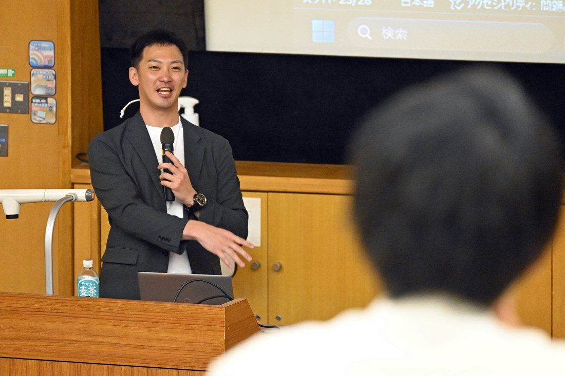 当日は、初めに体育学部長・体育学研究科長の内山秀一教授があいさつし、JICA横浜の佐藤綾氏が開発途上国での活動内容や応募資格といった事業概要を紹介しました。続いて、2022年から2年間、ボリビア・コチャバンバ市の野球・ソフトボール連盟に派遣され、野球を指導した竹林慎太朗氏が登壇。大学卒業後から8年間勤めた金融機関を退職して青年海外協力隊に応募した経緯を説明し、「小学生から大学生まで野球をしていましたが、スキルを社会に還元せず別のキャリアを築いているのはもったいないと感じるようになりました。スペイン語を習得し、将来的にプロ野球の球団に関わる仕事がしたいという思いもありました」と振り返りました。さらに、野球の普及活動や技術指導、日系ボリビア人の若者との出会いなど現地での経験を語り、「異文化やさまざまな価値観に触れて、自分の人生が豊かになりました。現在は派遣期間中に身に着けたスキルを生かして、プロ野球のリーグマーケティングに関する企業で勤めています。野球で日本と世界をつなげていけるよう仕事がしたい」と話していました。