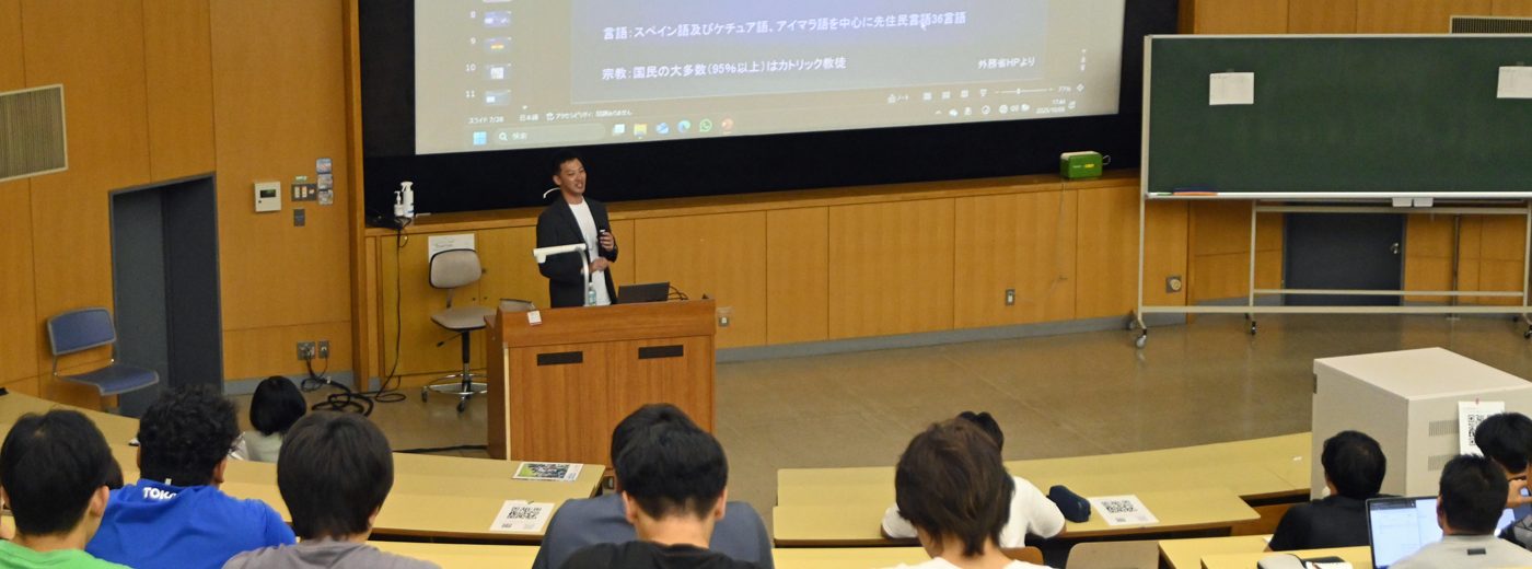 当日は、初めに体育学部長・体育学研究科長の内山秀一教授があいさつし、JICA横浜の佐藤綾氏が開発途上国での活動内容や応募資格といった事業概要を紹介しました。続いて、2022年から2年間、ボリビア・コチャバンバ市の野球・ソフトボール連盟に派遣され、野球を指導した竹林慎太朗氏が登壇。大学卒業後から8年間勤めた金融機関を退職して青年海外協力隊に応募した経緯を説明し、「小学生から大学生まで野球をしていましたが、スキルを社会に還元せず別のキャリアを築いているのはもったいないと感じるようになりました。スペイン語を習得し、将来的にプロ野球の球団に関わる仕事がしたいという思いもありました」と振り返りました。さらに、野球の普及活動や技術指導、日系ボリビア人の若者との出会いなど現地での経験を語り、「異文化やさまざまな価値観に触れて、自分の人生が豊かになりました。現在は派遣期間中に身に着けたスキルを生かして、プロ野球のリーグマーケティングに関する企業で勤めています。野球で日本と世界をつなげていけるよう仕事がしたい」と話していました。