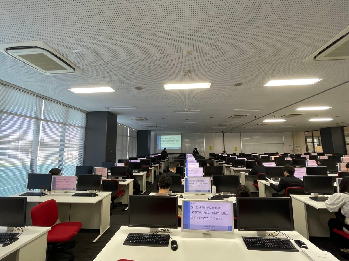 大学院化学専攻教授・大場先生より「全員がレベルの高い研究をしていて、発表もわかりやすく、誇れる成果が出せている。大学院での研究を通じてそれぞれが力を伸ばすことができたと感じる。4月からはそれぞれまた新たな場所で自信をもって活躍してほしい。」という講評がありました。