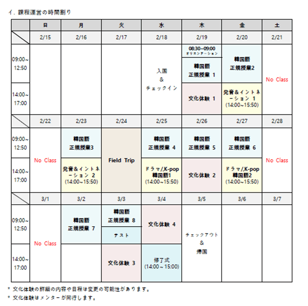 ・漢陽大学より送付された2025年度冬季短期留学プログラムのスケジュール(参考まで)。
