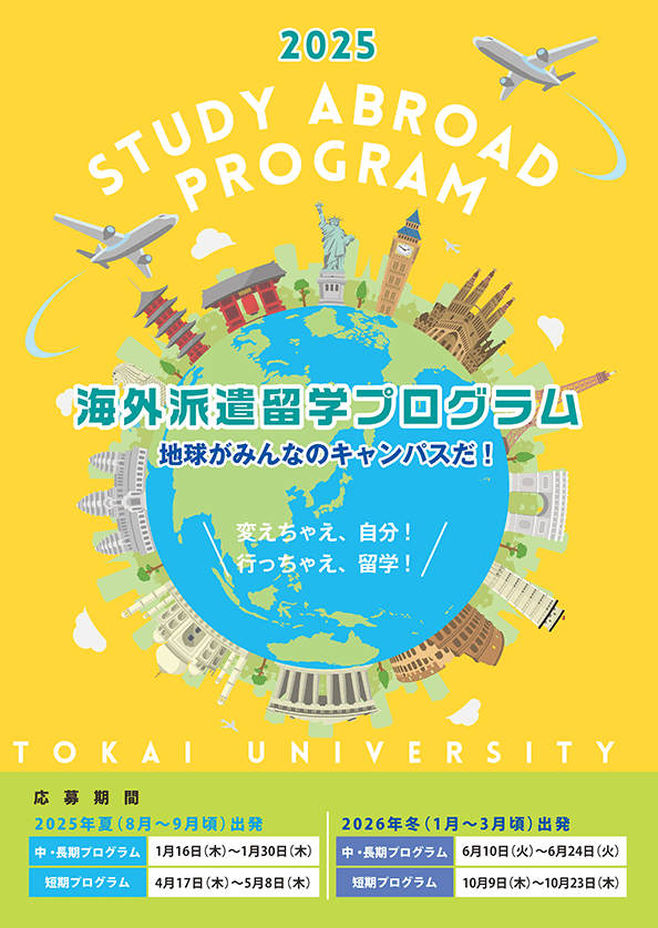- 留学先によっては学費を東海大学が負担するため、経済的負担が少なく留学ができます。