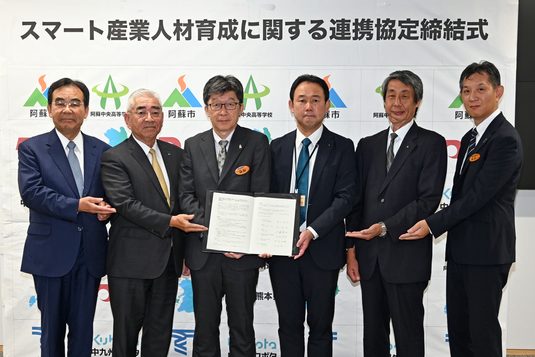 熊本キャンパスと阿蘇くまもと臨空キャンパスではこのほど、企業や行政、地元高校とスマート産業人材育成に関する連携協定を締結しました。ロボット技術やICTなどを活用したスマート農機の研究・開発などに取り組む株式会社中九州クボタが中心となり、熊本県阿蘇市、熊本県県北広域本部阿蘇地域振興局、県立阿蘇中央高校、熊本・臨空両キャンパスが参画するものです。同校でのスマート産業に関する教育活動を充実させるとともに、阿蘇市および熊本県における将来のスマート産業人材の育成に資することなどを目的としています。